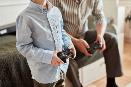 grandfather and grandson playing video game with joysticks in bed room while sitting on couch