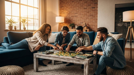 Young couple enjoying a board game night in their cozy living room, illuminated by warm lamp light, creating a relaxing and intimate atmosphere