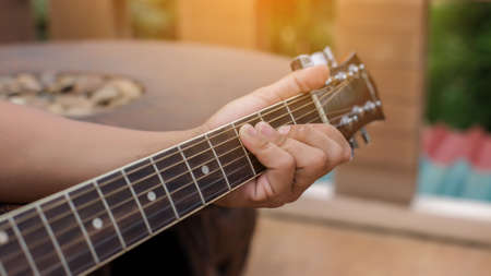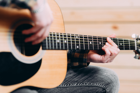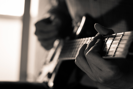 Practicing in playing guitar, Hand of young men playing guitar chord C, selective focus on finger