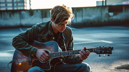 Stylish young man playing a guitar, creating music vibes in a quiet parking space. Copy space
