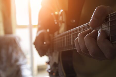 Repetition of rock music band. Cropped image of hands electric guitar player