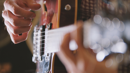 Male musician plays the guitar, hands close up, focus on the guitar fretboard