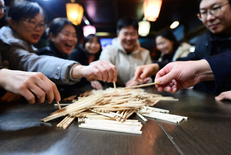 Group of people playing dominoes in a Chinese restaurant, close up