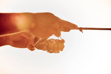 Fisherman with rod on the shore of the lake. Selective focus. Angler with Fishing Rod in Hands. Survival concept.