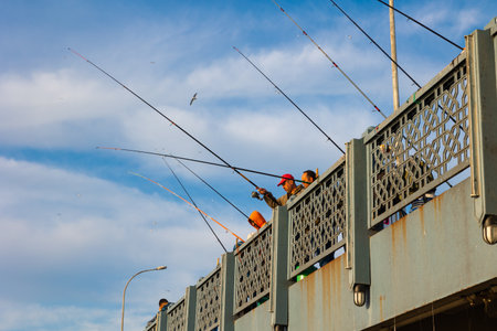 Fishermen on the Galata Bridge. Citizens or city life of Istanbul. Istanbul Turkey - 5.7.2022