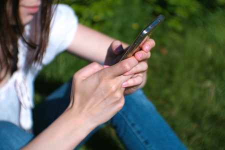 Beautiful young European girl sits on the grass in the park and uses a smartphone, concepts of using gadgets in a natural environment in the fresh air
