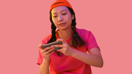 Gamer girl. Playing phone. Neon light relaxed teenager using mobile gadget enjoying online cybersport entertainment isolated on pink empty space background.