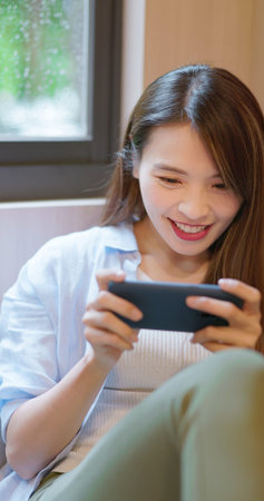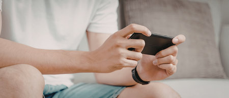 Good looking Asian male wearing a casual using a mobile phone in a horizontal way with two hands, sitting near window with natural light. Modern technology supports the business. Asian mobile gamer.