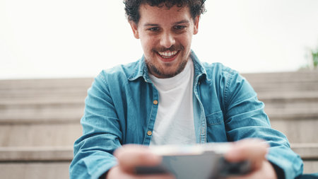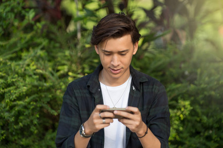 Close-up image of a happy young Asian man playing a mobile game while sitting at a table outdoor. people and modern technology concepts
