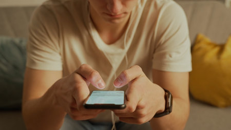 Portrait of young person in the room sitting on the couch. Close up shot of man in earphones holding smartphone and typing message in the app.