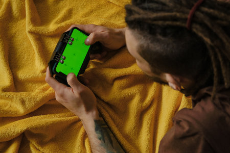 Young man lies inside on yellow blanket on bed and plays using phone and joystick, top view. Hands with multicolored tattoos close-up. Guy Uses Green Mock-up Screen Smartphone.