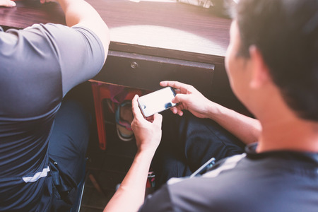 Asian man wearing glasses in white shirt is holding smartphone horizontally with both hands while sitting in cafe. Playing games, Chilling Outside.