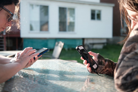 Two friends communicate, holding smartphone in hands, touching screen with fingers