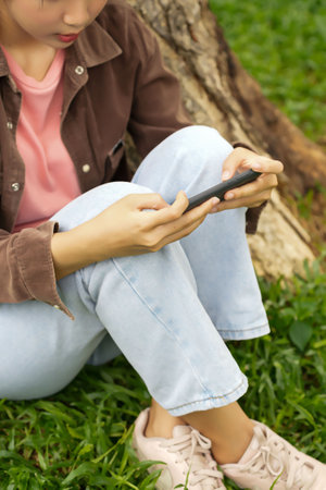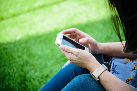 Young girl sitting on green grass with mobile phone.woman using her Mobile Phone. female student reading text messages on her mobile phone.