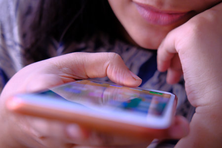 MOSCOW, RUSSIA - December 2019: back view of a close up of a woman hands playing online game on a smart phone lying on a couch at home
