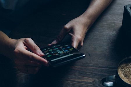 Close-up image of male hands using smartphone searching or social networks concept, hipster man typing an sms message to his friends on vintage wood table in cafe