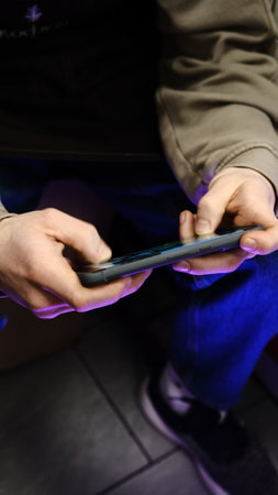 Young man playing mobile game with fast finger movements and colorful pulsating hand lights, dynamic gameplay, close up phone screen, digital entertainment, gaming action, energetic gaming session.