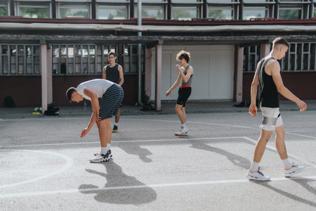 Young men playing basketball outdoors on a sunny urban court, teamwork and competition on display