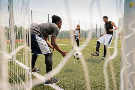 Young African soccer player catching the ball while his rival kicking it