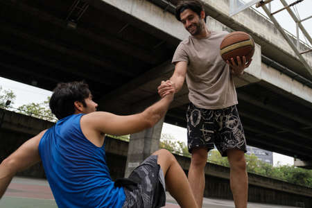 Sports and recreation concept young male teenagers practicing dribbling basketball in the court after school.