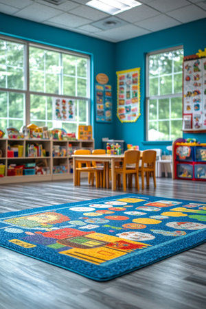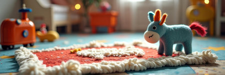 Colorful children's playroom with plush toy and cozy carpet in bright sunlight. That the image is generated using AI.