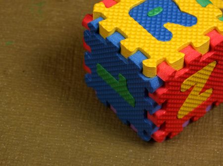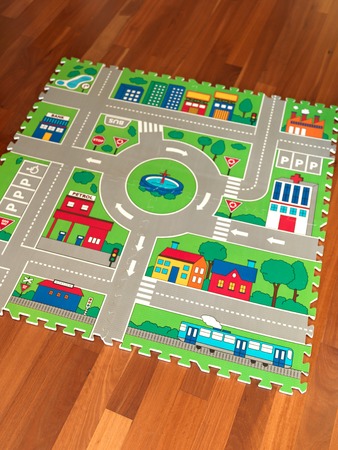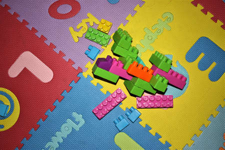 Childrens kindergarten toys resting on a brightly colored soft foam tiled floor