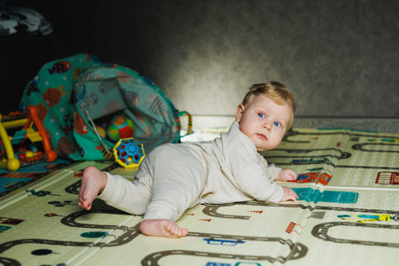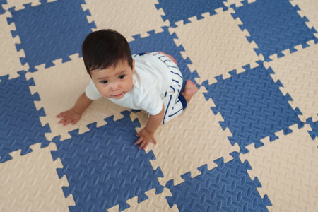 Above angle shot of adorable Baby boy lying on child friendly floor puzzle mats looking up