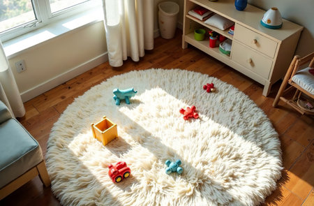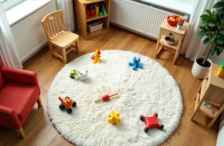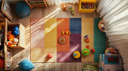 Children room with a play area, toys, and a colorful rug. Top view, ample copy space