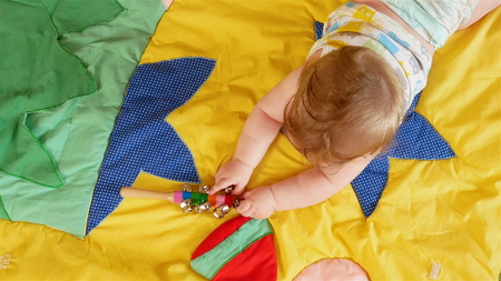 Baby girl with many colorful toys. Little child lying on playmat. Infant kid in nursery.