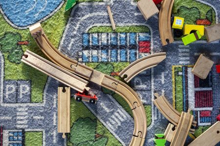 baby hands playing and learning with wooden train set on wooden rails on a carpet in nursery at home