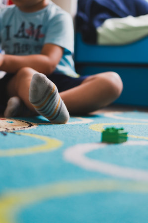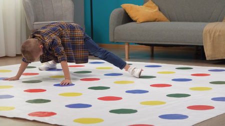 Close up of the bright room, twister game on the floor, boy playing, stepping on colorful dots with hands and feet.