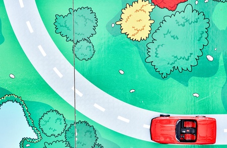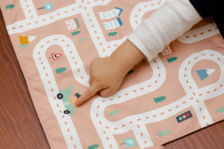 top view of a baby's hand pointing to a toy circuit with a car circulating