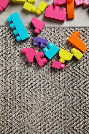 Colorful plastic building blocks on floor, flat lay. Space for text