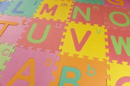 high view of colorful mats with letters of the alphabet and puppet gosling