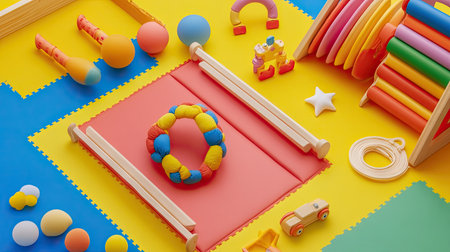A vibrant collection of baby toys in a playful arrangement, perfect for stimulating early development in a cheerful and safe environment.