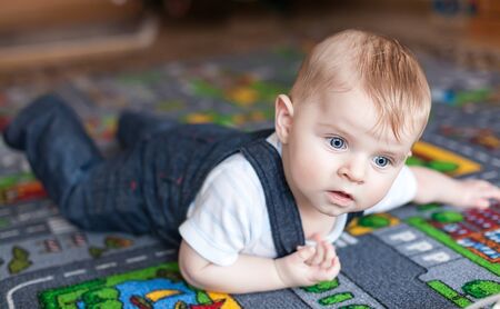 Photo of a 7-9 month old baby at home. A smiling child lies on the floor and plays with toys. Cute boy sitting on the floor.