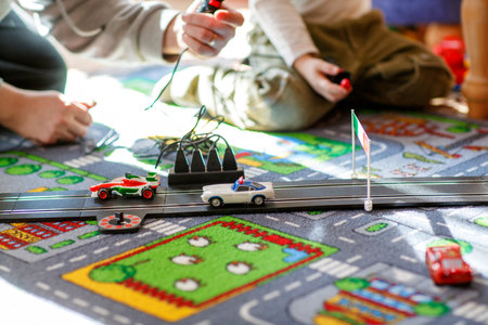 Father and son playing with racing cars on racetrack, indoors, with cars. Happy little preschool boy and young man having fun with indoor race game