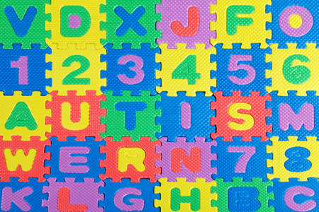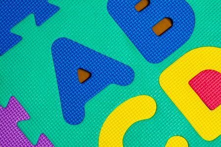 Rubber mat with colorful alphabet design isolated on wood texture board as background.