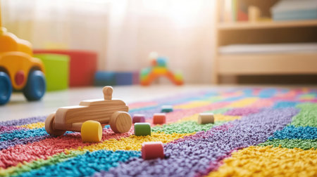 A serene playroom scene featuring a wooden toy tractor on a colorful rug surrounded by building blocks, capturing the essence of childhood creativity and joy in natural sunlight.
