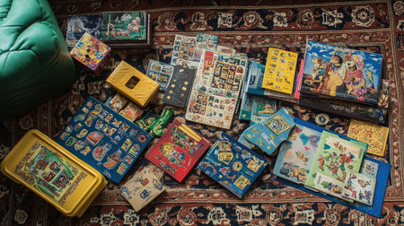 A vibrant collection of vintage stickers and albums showcasing colorful designs and nostalgic themes, arranged creatively on a patterned carpet. Perfect for arts.