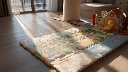 A bright and inviting living room featuring a colorful soft puzzle mat and a cheerful toy house, designed for children's playtime activities, enhanced by warm morning light.