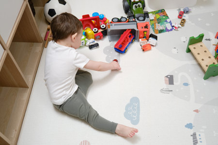 Toddler baby boy is playing cars sitting on a rug in the nursery. A small child is playing with toys. Kid aged one year eight months