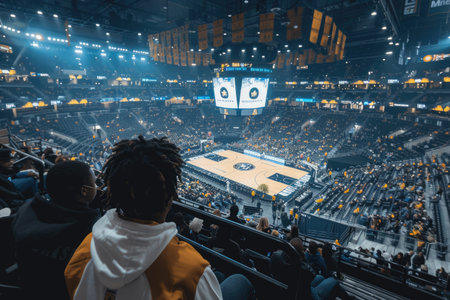 Amidst the electrifying atmosphere of the stadium, a sea of enthusiastic sports fans rises to their feet, their cheers echoing throughout the arena as they rally behind their beloved team, encouraging them towards victory with unwavering support.