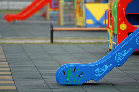 Bright colorful slides on nursery playground with soft rubber flooring on bright sunny summer day. Children activities and recreation outdoors.