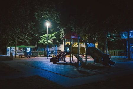 Night scene of a children's playground in the Balkan town during spring.