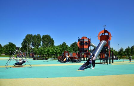 Multicolored playground with different activities outdoor in a park – Recreative and fun place for children with swings and slides