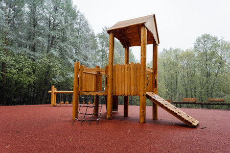 Empty children playground in the park during winter time. Selective focus.