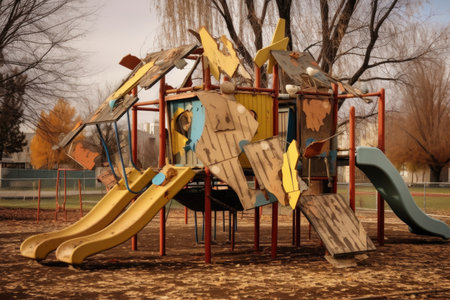 damaged playground equipment after windstorm, created with generative ai