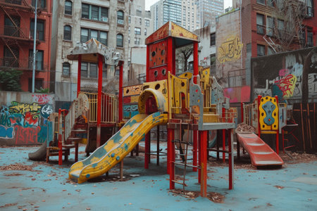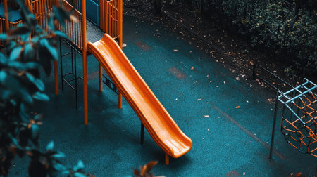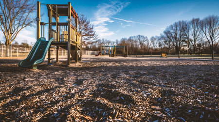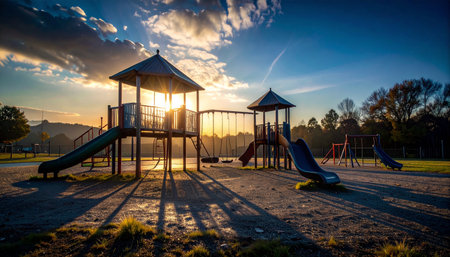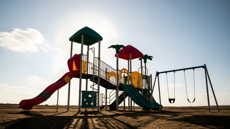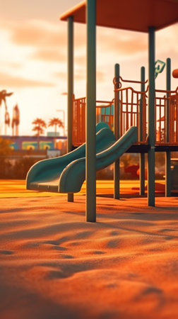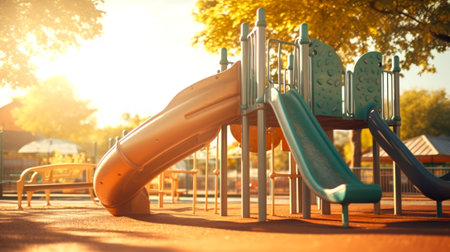 Deserted playground with slide in sunset light. Concept of evening leisure, childhood memories, and community spaces.