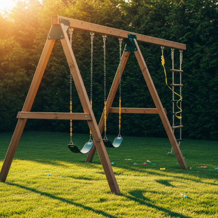 In a beautiful park with lush trees, a charming wooden playground offers shade and a serene atmosphere, making it ideal for childrens play and promoting outdoor activity and happiness